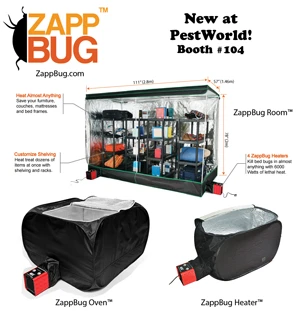 New to PestWorld 2013 is The ZappBug Room and ZappBug Heater. The ZappBug Room is a portable thermal chamber with a capacity measuring 80” x 111”x 57.5.” ZappBug kills 100% of all bed bugs in all life stages, including eggs, nymphs and adults, the company reports. It can be used to rid bed bugs in in couches, beds, tables, books, files, luggage, electronics and more. ZappBug technology is based on scientific evidence that proves bed bugs die in one minute at temperatures above 120°F. The ZappBug Heater is designed for travelling and is highly portable; it can compact to travel as a 13" cube, but expands to 43"x 22.75" x 24" — enough to treat checked or carry-on luggage. The ZappBug Oven has 25-cubic-feet of bed bug killing capacity and can treat small furniture, luggage, area rugs and other belongings. All products are easy to use; each features a set-up time under 10 minutes, a tip over safety feature, wireless temperature probes, and an automatic timer.